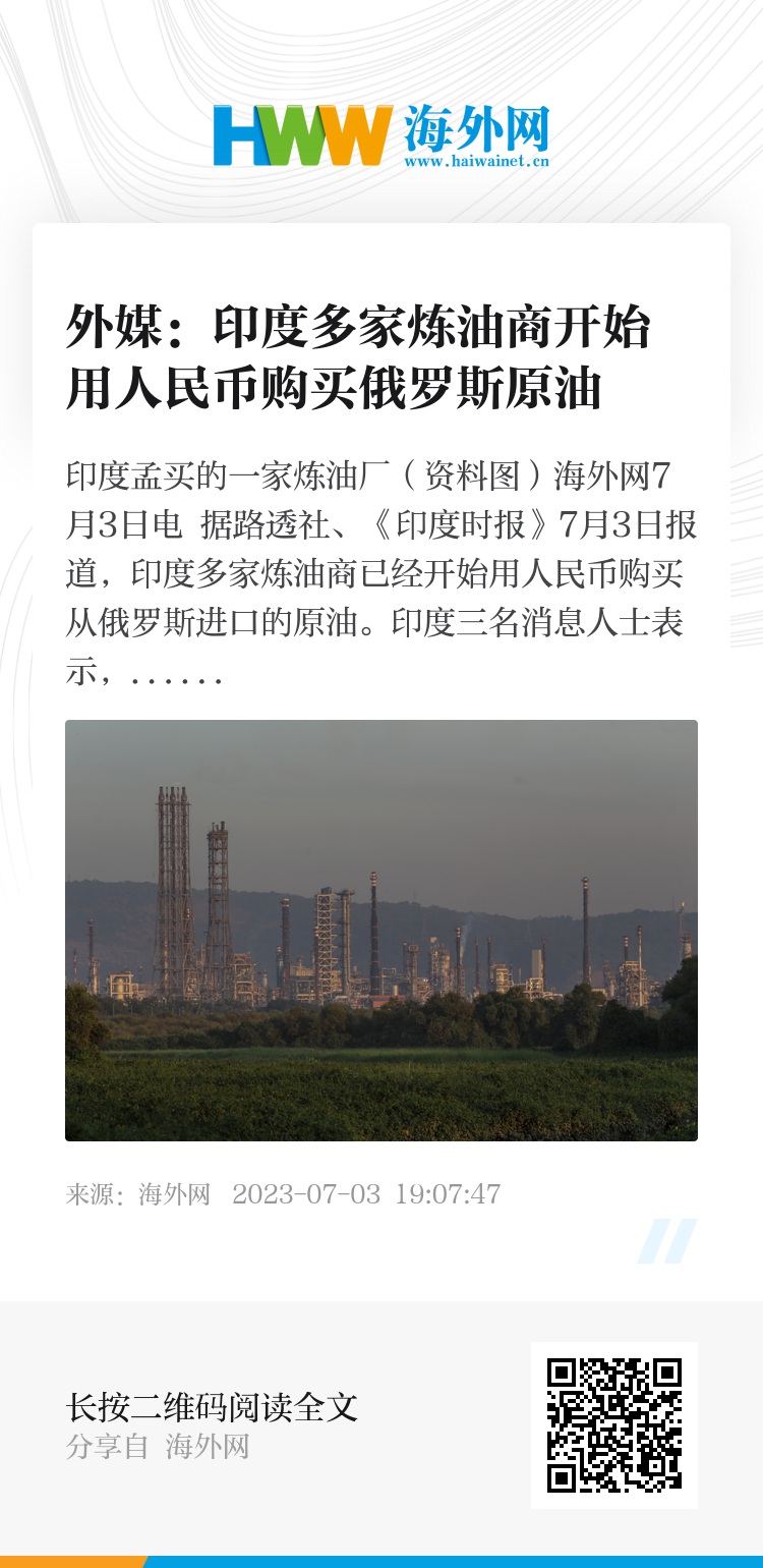 海外网7月3日电 据路透社、《印度时报》7月3日报道,印度多家炼油商已经开始用人民币购买从俄罗斯进口的原油。