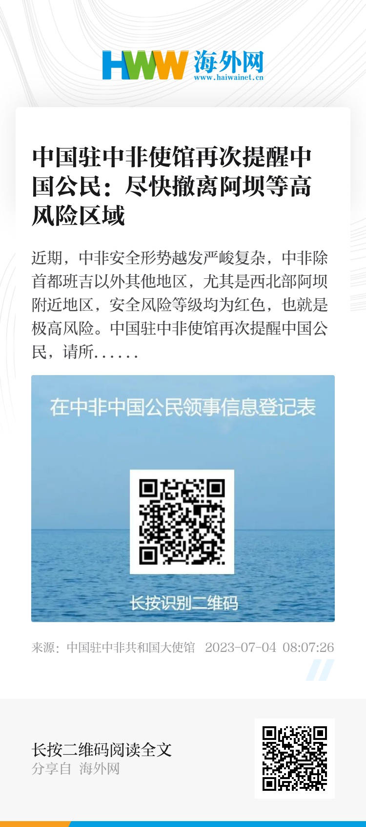 近期,中非安全形势越发严峻复杂,中非除首都班吉以外其他地区,尤其是西北部阿坝附近地区,安全风险等级均为红色,也就是极高风险。中国驻中非使馆再次提醒中国公民,请所有在中非境内的中国机构企业和公民坚决杜绝麻痹思想和侥幸心理,树立底线思维,切勿前往和停留在首都班吉以外地区,切实提高安全风险意识,妥善做好安全防范,尽快撤离阿坝等高风险区域。请所有尚在外省的机构企业和人员尽快撤离或转移至安全地区,同时务必尽快完成个人信息报备。