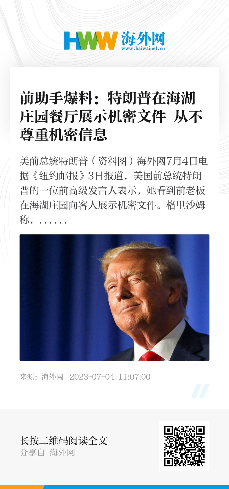 海外网7月4日电 据《纽约邮报》3日报道,美国前总统特朗普的一位前高级发言人表示,她看到前老板在海湖庄园向客人展示机密文件。