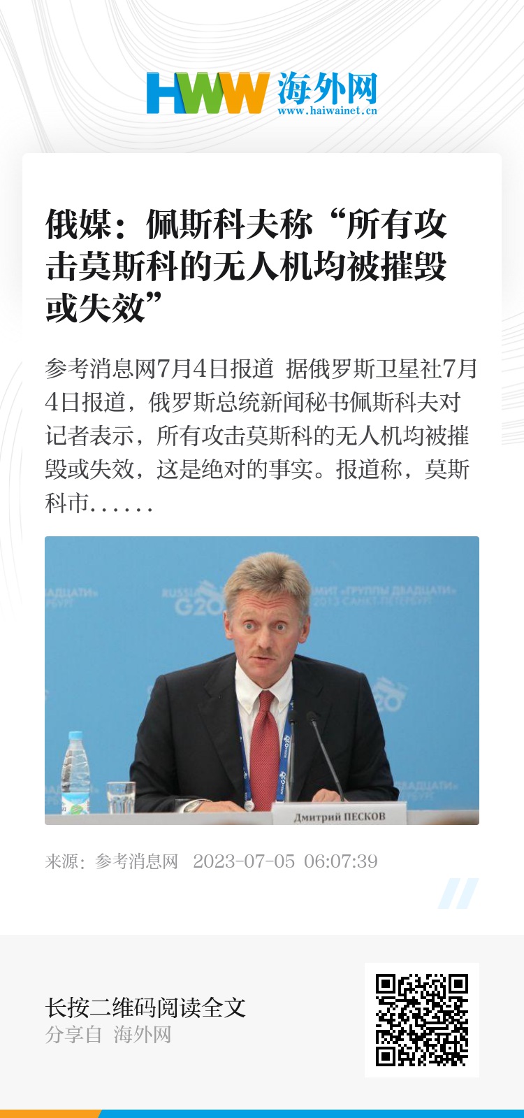 参考消息网7月4日报道 据俄罗斯卫星社7月4日报道,俄罗斯总统新闻秘书佩斯科夫对记者表示,所有攻击莫斯科的无人机均被摧毁或失效,这是绝对的事实。