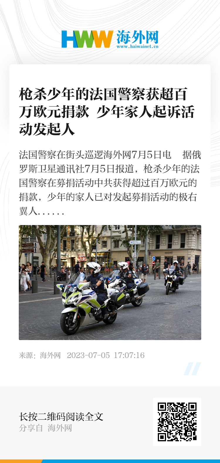 海外网7月5日电 据俄罗斯卫星通讯社7月5日报道,枪杀少年的法国警察在募捐活动中共获得超过百万欧元的捐款,少年的家人已对发起募捐活动的极右翼人士提起了诉讼。