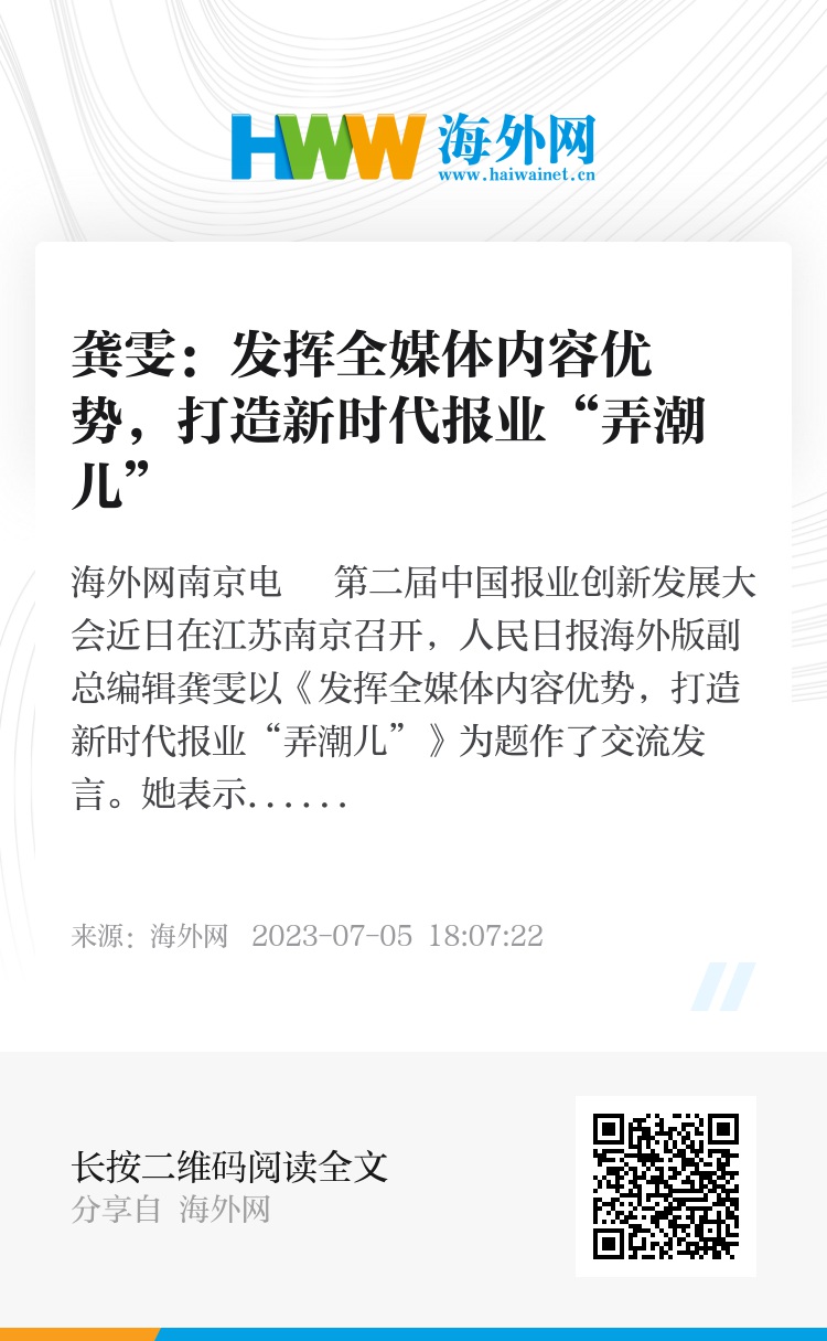 龚雯表示,在提升党报品牌效应和资源优势、促进传统报业转型升级、加快媒体深度融合等方面,人民日报海外版已作出一些有益探索,构建了“海字号”融媒矩阵。但创新永无止境,特别是在体制机制创新上还有待更多突破,胆子和步子还要再大些,持续推动报业融合发展走向深处,在移动化、可视化、社交化、智能化的全媒体变革大潮中赢得主动。