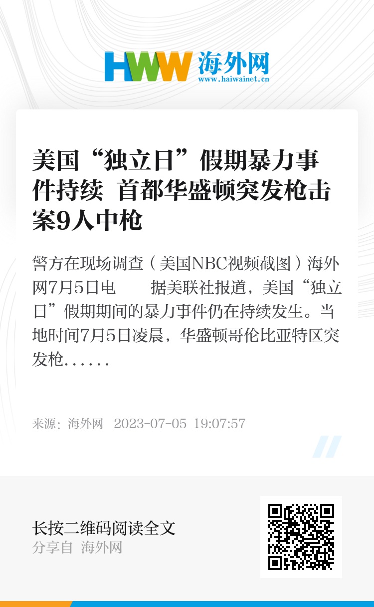 海外网7月5日电 据美联社报道,美国“独立日”假期期间的暴力事件仍在持续发生。当地时间7月5日凌晨,华盛顿哥伦比亚特区突发枪击事件,造成9人受伤,其中包括2名青少年。