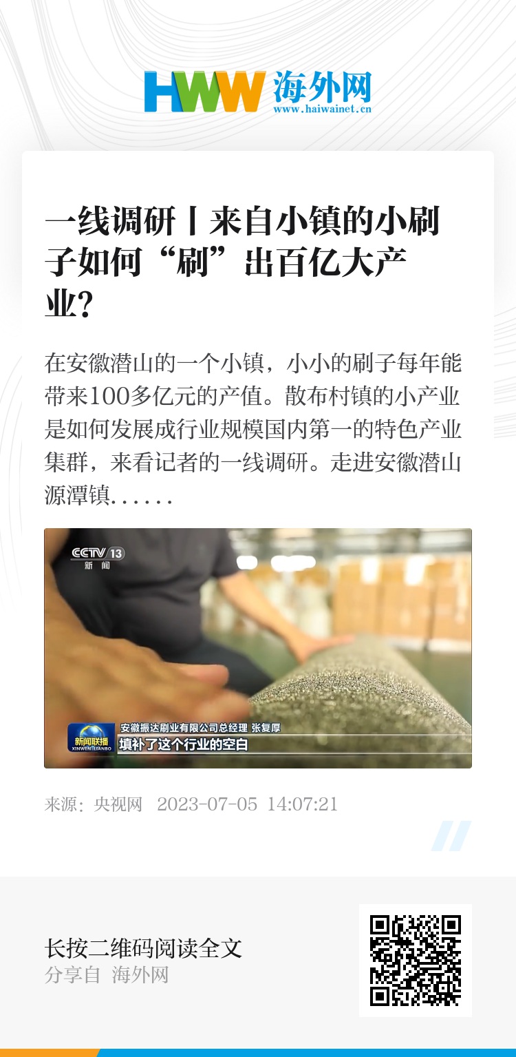 在安徽潜山的一个小镇,小小的刷子每年能带来100多亿元的产值。散布村镇的小产业是如何发展成行业规模国内第一的特色产业集群,来看记者的一线调研。