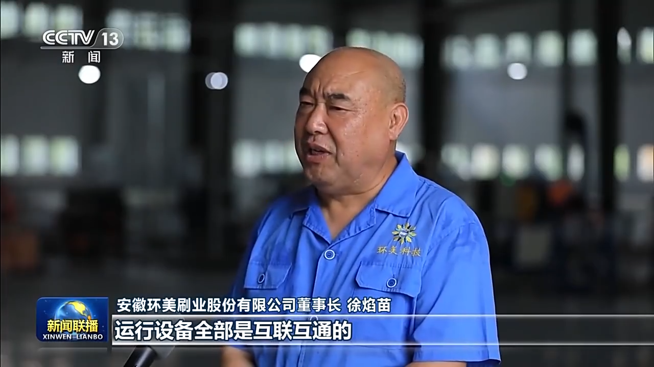 安徽环美刷业股份有限公司董事长 徐焰苗:这个车间布局的传感器将有2000多个,运行设备全部是互联互通的,我们预计的目标是产能翻一番。