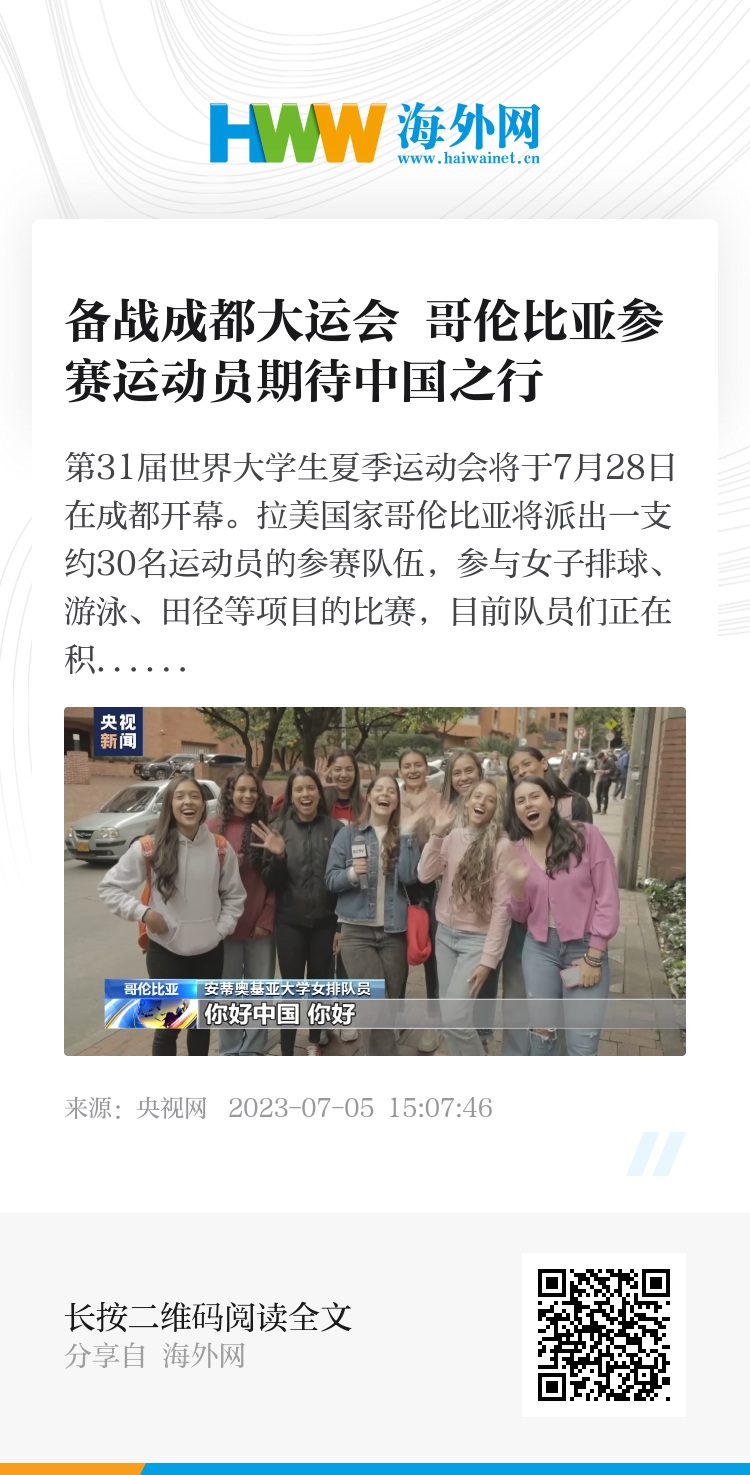 第31届世界大学生夏季运动会将于7月28日在成都开幕。拉美国家哥伦比亚将派出一支约30名运动员的参赛队伍,参与女子排球、游泳、田径等项目的比赛,目前队员们正在积极备战。