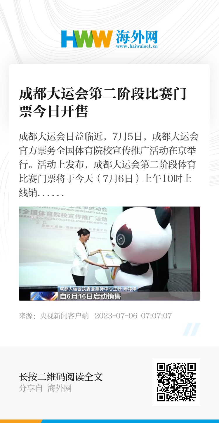 成都大运会日益临近,7月5日,成都大运会官方票务全国体育院校宣传推广活动在京举行。活动上发布,成都大运会第二阶段体育比赛门票将于今天(7月6日)上午10时上线销售。