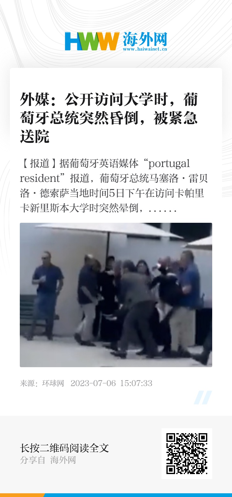 【环球网报道】据葡萄牙英语媒体“portugal resident”报道,葡萄牙总统马塞洛·雷贝洛·德索萨当地时间5日下午在访问卡帕里卡新里斯本大学时突然晕倒,被紧急送往医院。