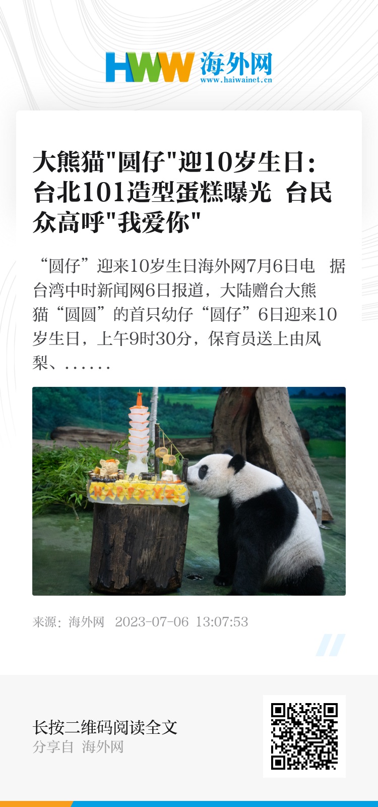 海外网7月6日电 据台湾中时新闻网6日报道,大陆赠台大熊猫“圆圆”的首只幼仔“圆仔”6日迎来10岁生日,上午9时30分,保育员送上由凤梨、胡萝卜、奇异果等食材制成的“台北101”造型生日蛋糕。