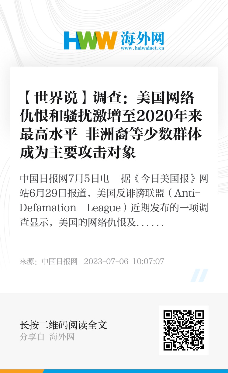 中国日报网7月5日电 据《今日美国报》网站6月29日报道,美国反诽谤联盟(Anti-Defamation League)近期发布的一项调查显示,美国的网络仇恨及网络骚扰激增,非裔、穆斯林等少数群体成为主要的攻击对象。