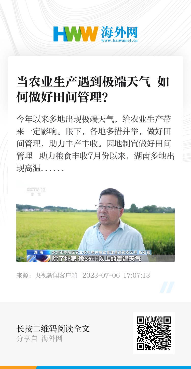 7月份以来,湖南多地出现高温天气,局部地区最高温度超过39℃,使早稻容易出现早熟、空壳等现象。在永州市零陵区,农业部门组织飞防人员,对部分早稻田进行根外追肥,增强早稻植株对高温的抗性,减轻高温热害。同时派出超过120名农技人员深入各个早稻产区乡镇指导种粮户“以水调温”,加强夏管时期的田间水分管理。