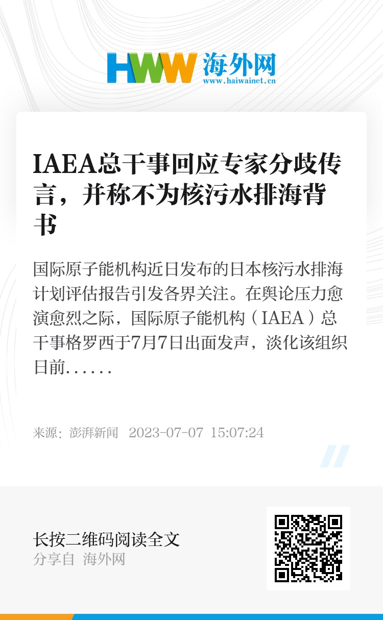 格罗西还强调了国际原子能机构不为日本核污水排海的决定背书。格罗西称,国际原子能机构发布的有关报告绝不意味着国际原子能机构“认可”核污水排海计划。核污水排海的最终决定只能由日本政府做出。格罗西反复澄清国际原子能机构参与该报告程度有限:“我们没有认可该计划,也没有建议这样做。我们只说该计划符合(科学)标准。”