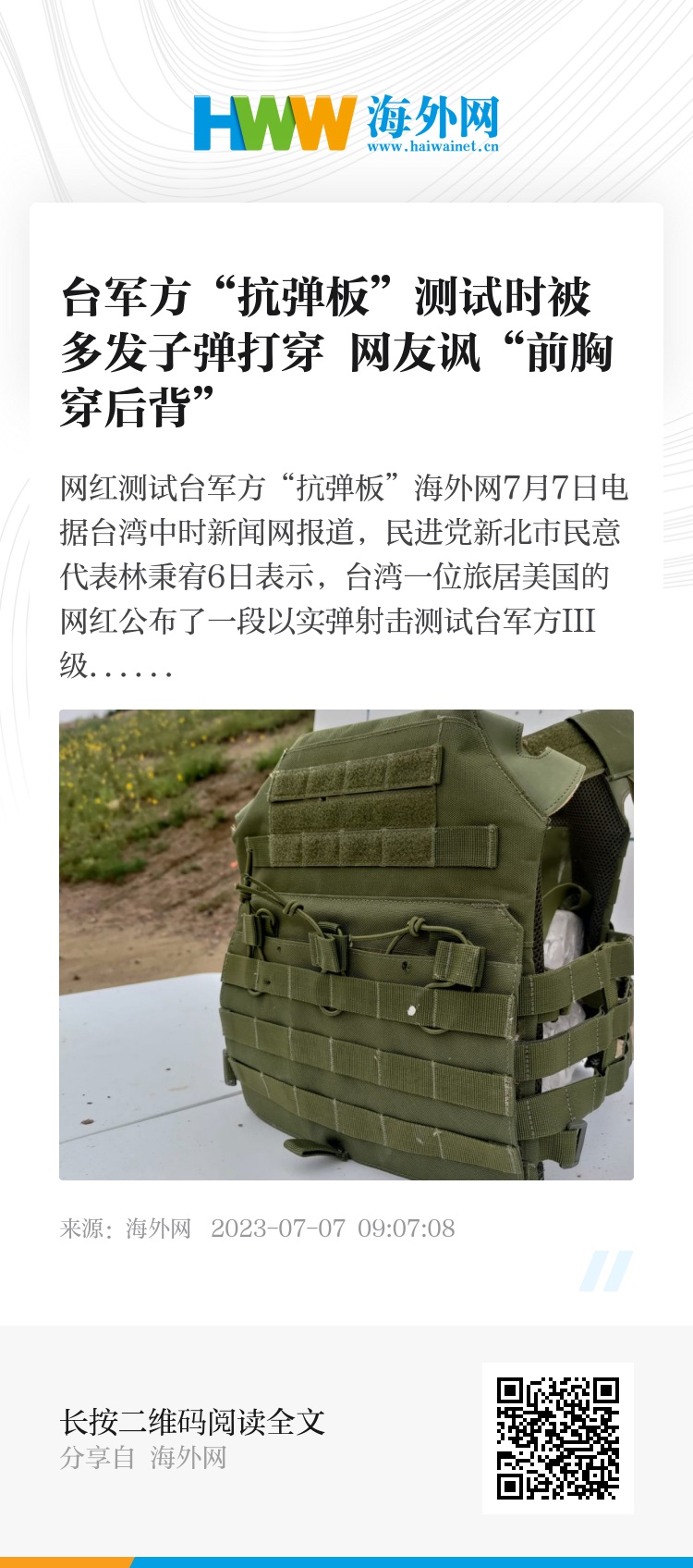 海外网7月7日电 据台湾中时新闻网报道,民进党新北市民意代表林秉宥6日表示,台湾一位旅居美国的网红公布了一段以实弹射击测试台军方III级“抗弹板”的视频,结果显示,“抗弹板”被多发子弹打穿。视频引发岛内热议,有网友讽刺台军方的防弹设备能让子弹“前胸穿后背”。