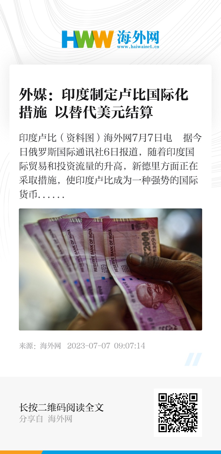 海外网7月7日电 据今日俄罗斯国际通讯社6日报道,随着印度国际贸易和投资流量的升高,新德里方面正在采取措施,使印度卢比成为一种强势的国际货币,以替代美元进行国际贸易结算。