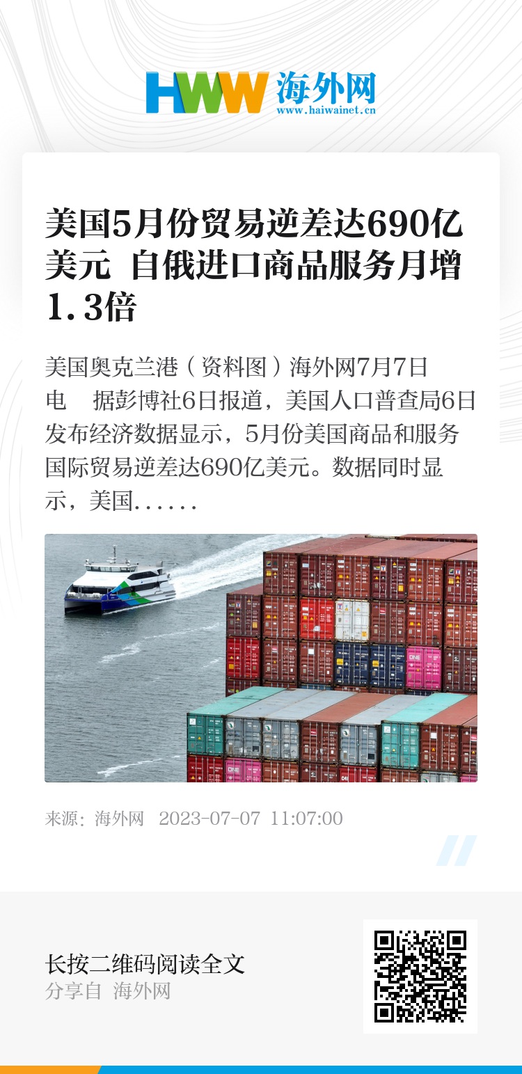 海外网7月7日电 据彭博社6日报道,美国人口普查局6日发布经济数据显示,5月份美国商品和服务国际贸易逆差达690亿美元。