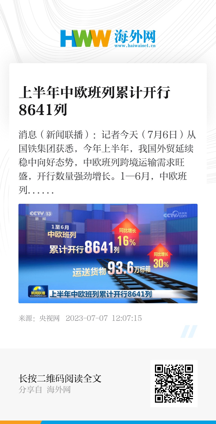 央视网消息(新闻联播):记者今天(7月6日)从国铁集团获悉,今年上半年,我国外贸延续稳中向好态势,中欧班列跨境运输需求旺盛,开行数量强劲增长。1—6月,中欧班列累计开行8641列,运送货物93.6万标箱,同比分别增长16%和30%。