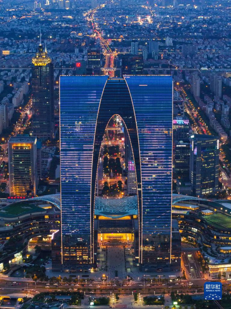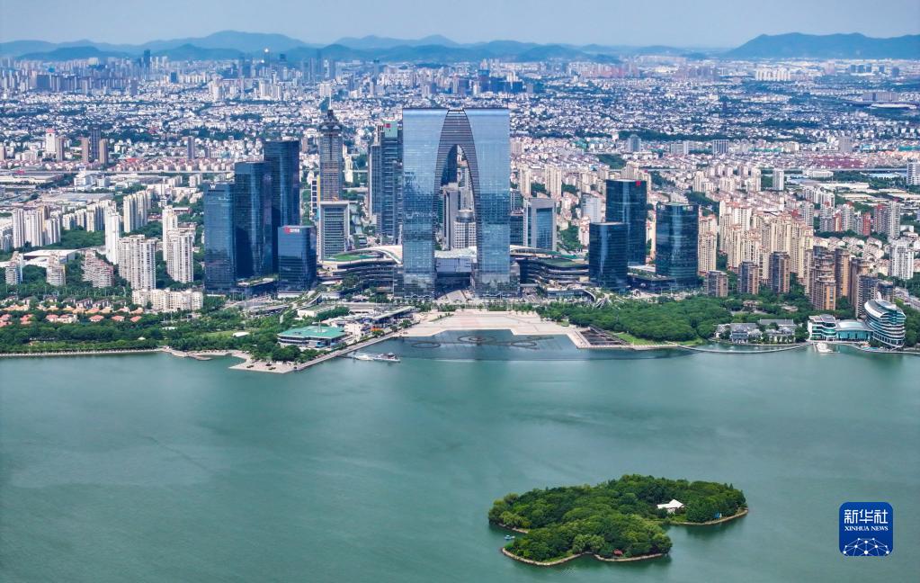 苏州工业园区东方之门(7月3日摄,无人机照片)。