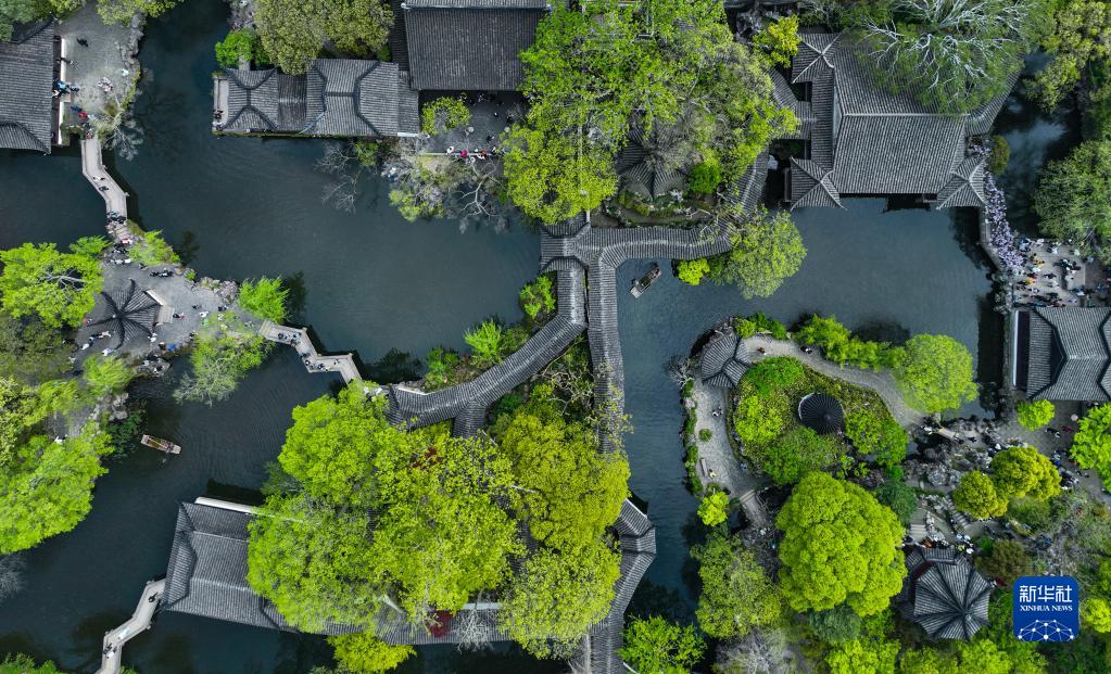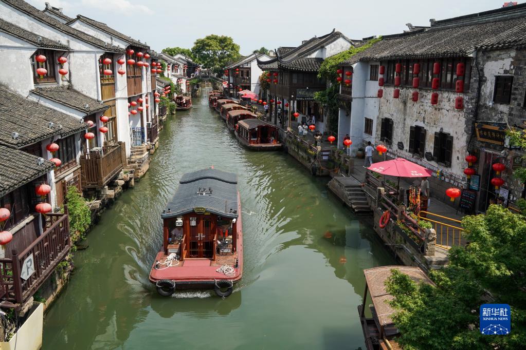 游客在苏州平江历史街区休闲游玩(7月3日摄,无人机照片)。