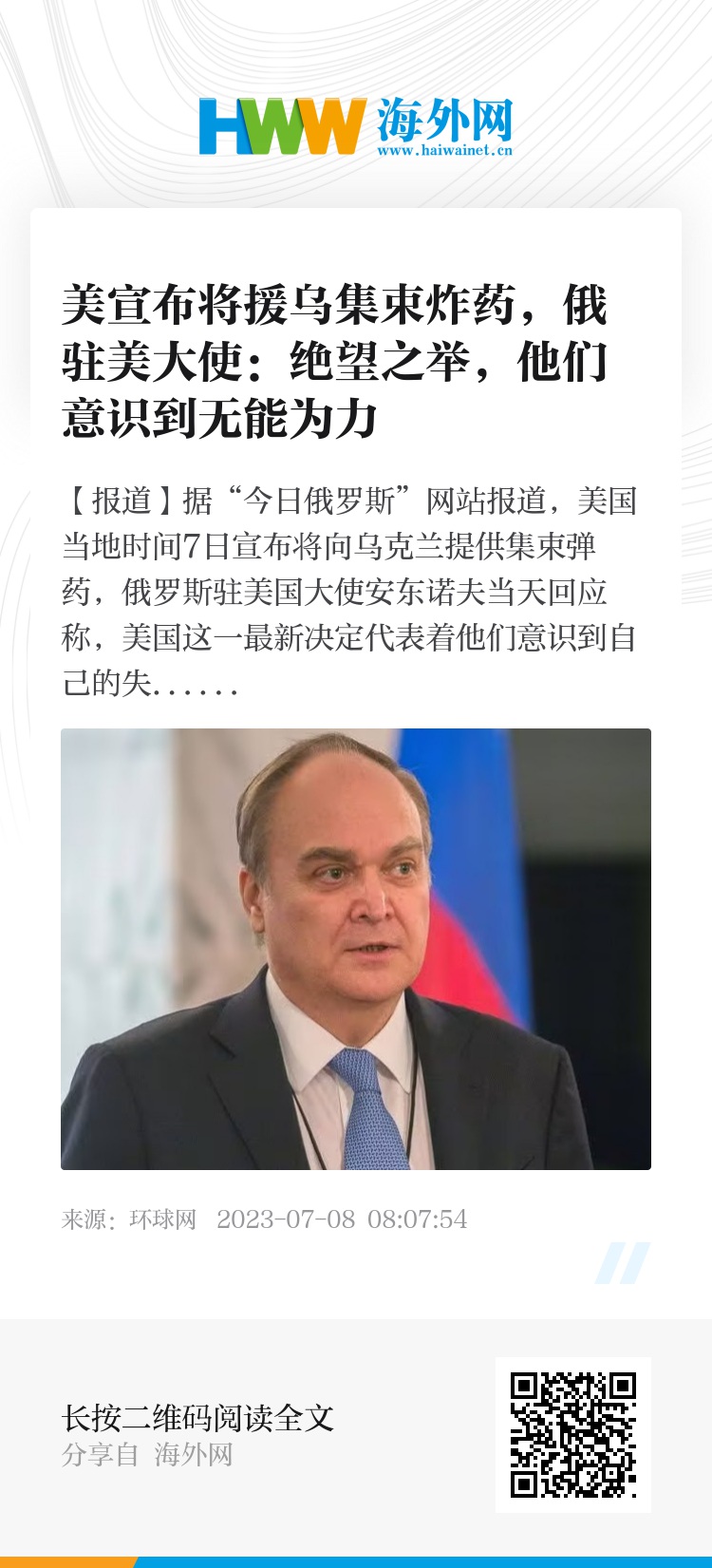 【环球网报道】据“今日俄罗斯”网站报道,美国当地时间7日宣布将向乌克兰提供集束弹药,俄罗斯驻美国大使安东诺夫当天回应称,美国这一最新决定代表着他们意识到自己的失败,也是一种为回避失败的绝望尝试。