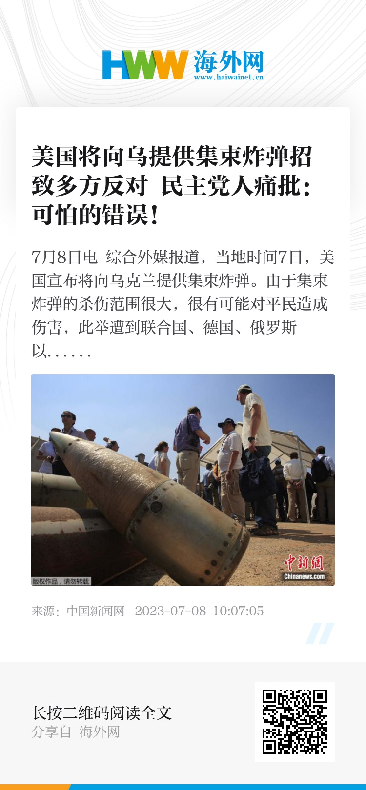 中新网7月8日电 综合外媒报道,当地时间7日,美国宣布将向乌克兰提供集束炸弹。由于集束炸弹的杀伤范围很大,很有可能对平民造成伤害,此举遭到联合国、德国、俄罗斯以及美国国会民主党人等多方批评,美国众议院国防拨款小组委员会首席议员麦科勒姆表示,拜登政府此举“是一个可怕的错误”。