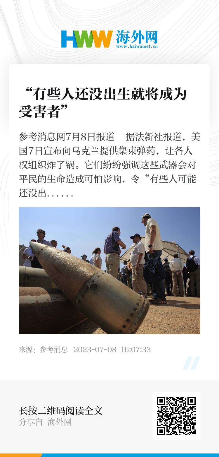 参考消息网7月8日报道 据法新社报道,美国7日宣布向乌克兰提供集束弹药,让各人权组织炸了锅。它们纷纷强调这些武器会对平民的生命造成可怕影响,令“有些人可能还没出生就将成为受害者”。