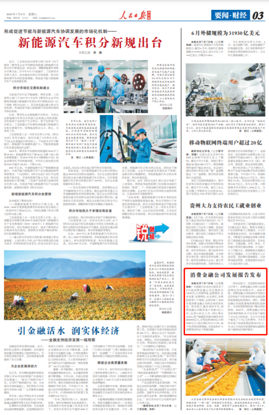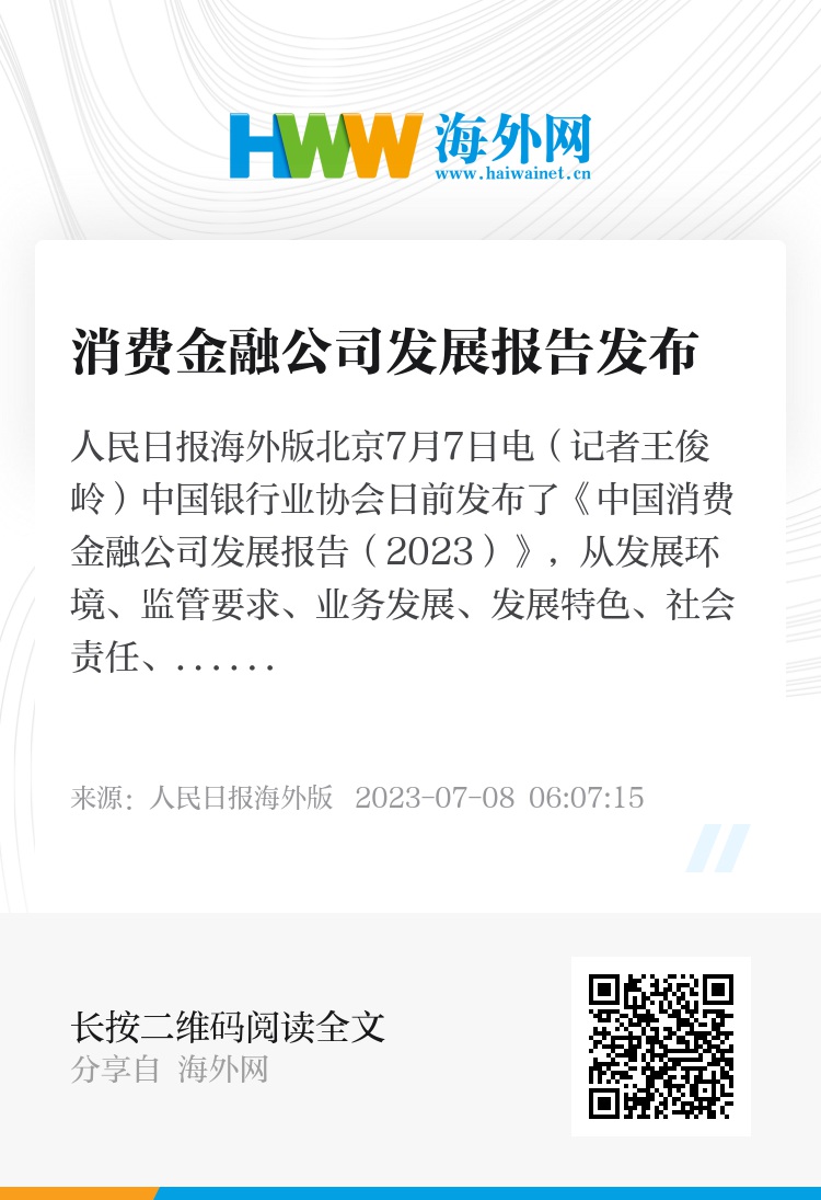人民日报海外版北京7月7日电(记者王俊岭)中国银行业协会日前发布了《中国消费金融公司发展报告(2023)》,从发展环境、监管要求、业务发展、发展特色、社会责任、发展趋势等六个维度,全面反映了2022年度消费金融公司的总体经营状况。报告显示,截至2022年末,消费金融公司服务客户突破3亿人次,达到3.38亿人次,同比增长18.4%;资产规模及贷款余额双双突破8000亿元,分别达到8844亿元和8349亿元,同比增长均为17.5%,高于经济和消费增速,为恢复和扩大消费需求作出了积极贡献。