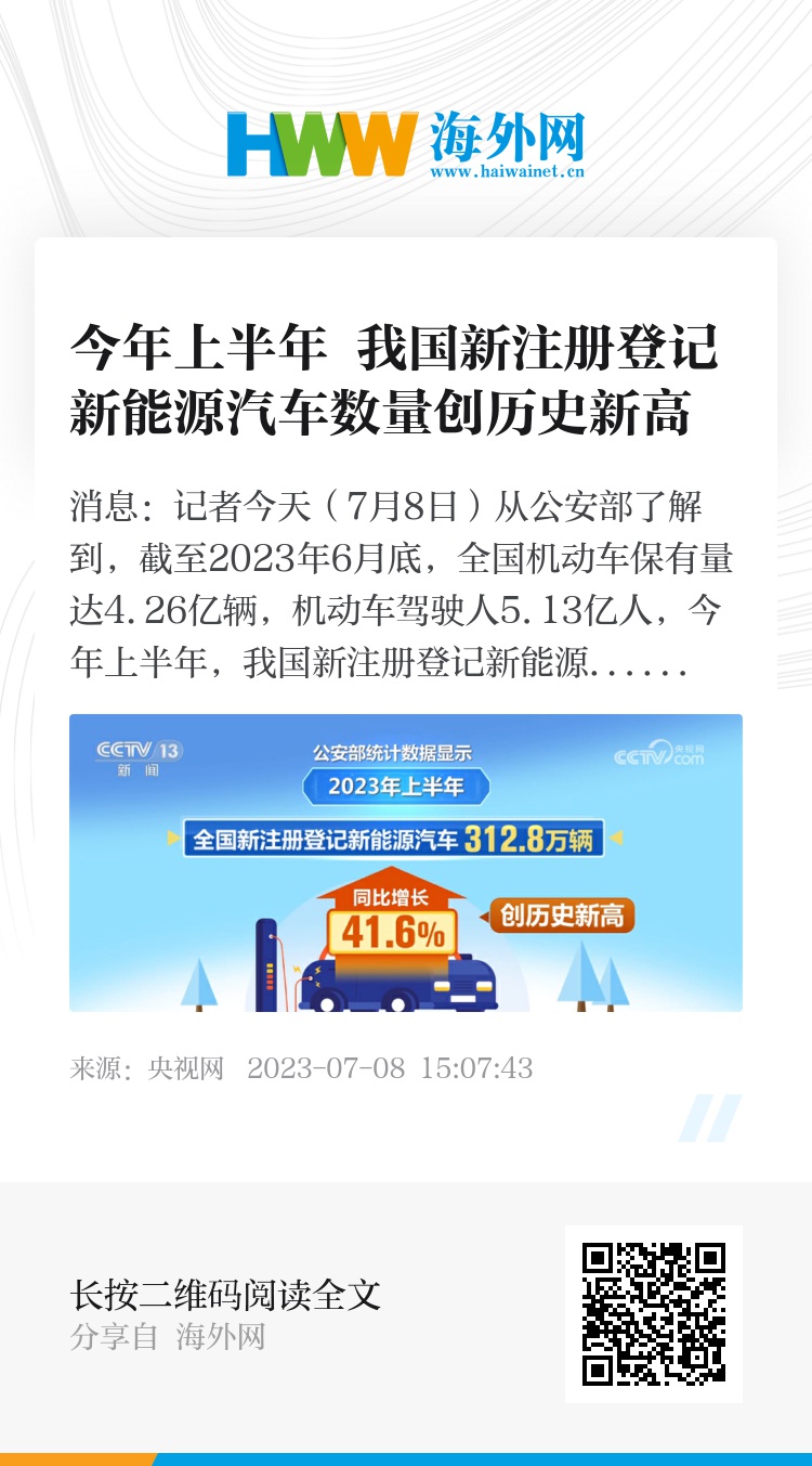 央视网消息:记者今天(7月8日)从公安部了解到,截至2023年6月底,全国机动车保有量达4.26亿辆,机动车驾驶人5.13亿人,今年上半年,我国新注册登记新能源汽车数量创历史新高。