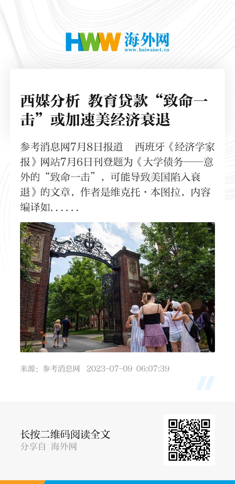 参考消息网7月8日报道 西班牙《经济学家报》网站7月6日刊登题为《大学债务——意外的“致命一击”,可能导致美国陷入衰退》的文章,作者是维克托·本图拉,内容编译如下: