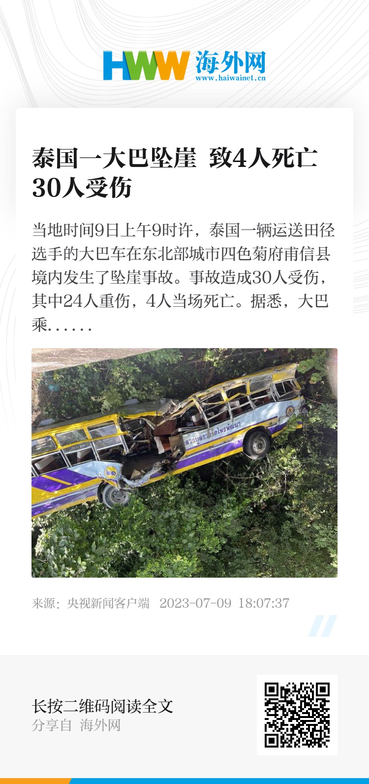 当地时间9日上午9时许,泰国一辆运送田径选手的大巴车在东北部城市四色菊府甫信县境内发生了坠崖事故。事故造成30人受伤,其中24人重伤,4人当场死亡。