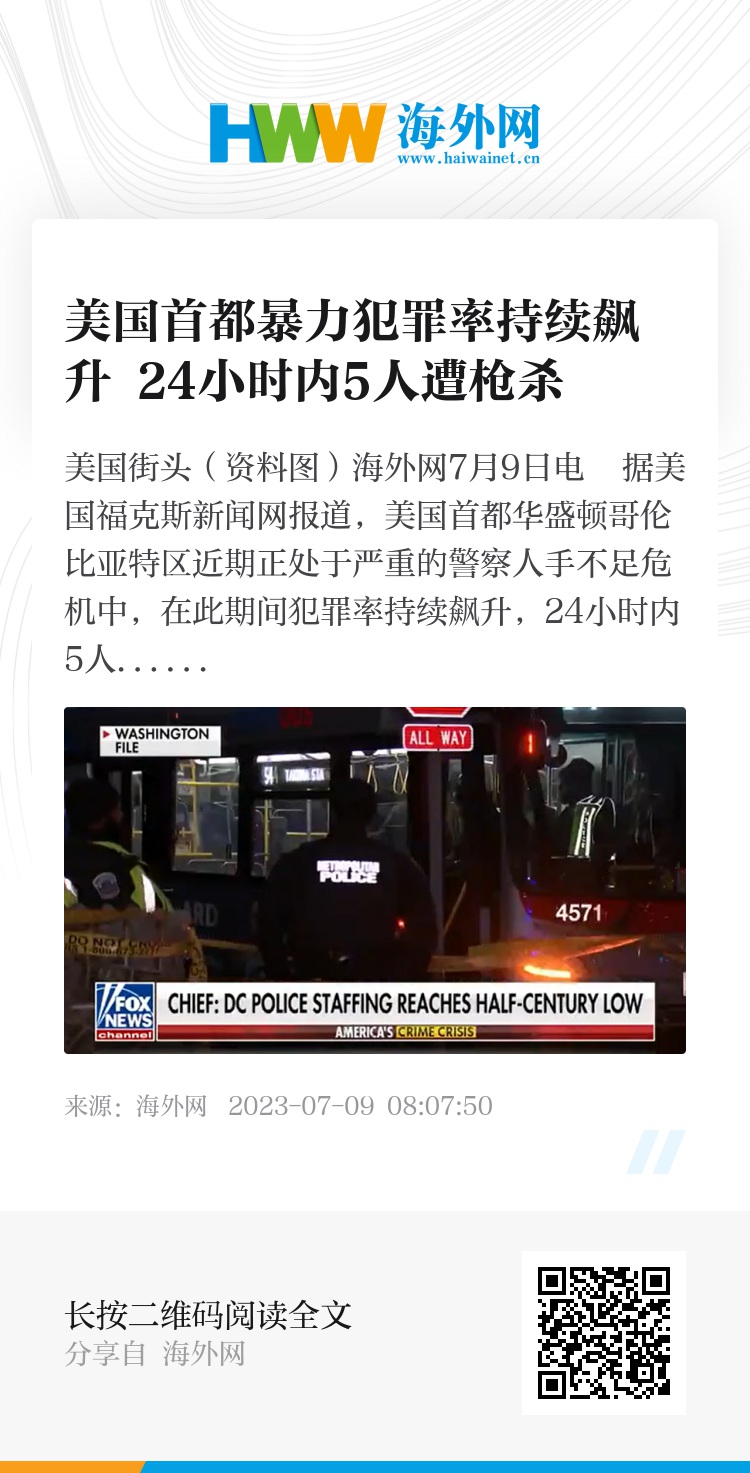 海外网7月9日电 据美国福克斯新闻网报道,美国首都华盛顿哥伦比亚特区近期正处于严重的警察人手不足危机中,在此期间犯罪率持续飙升,24小时内5人遭枪杀,过去一星期内,遭枪击死亡人数达13人。