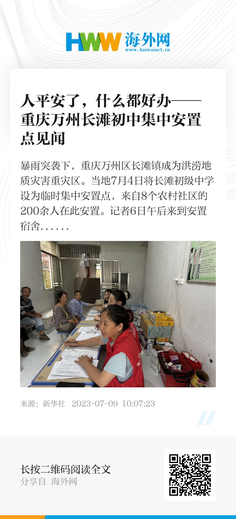 暴雨突袭下,重庆万州区长滩镇成为洪涝地质灾害重灾区。当地7月4日将长滩初级中学设为临时集中安置点,来自8个农村社区的200余人在此安置。