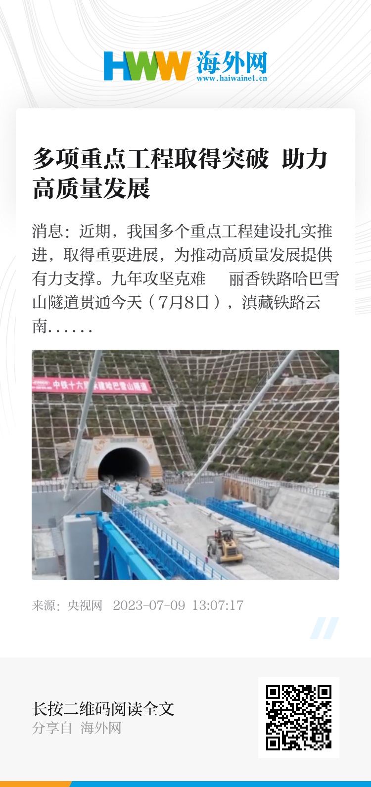 央视网消息:近期,我国多个重点工程建设扎实推进,取得重要进展,为推动高质量发展提供有力支撑。