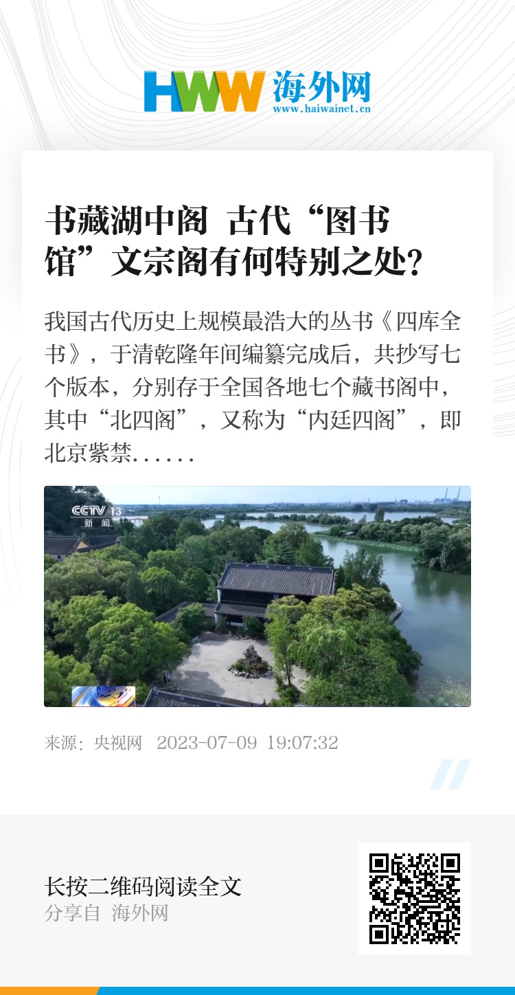 总台记者 徐大为:文宗阁始建于1779年,当时建设文宗阁是为了收藏《古今图书集成》这本大书,随着《四库全书》编纂完成,这也成为收藏《四库全书》的七个阁中间的一个阁。文宗阁的原址,就在我现在所在的地方再向西侧大概两百米,几经战火之后,文宗阁几乎是完全损坏,所以在2011年的时候,复建的文宗阁正式地对外开放。