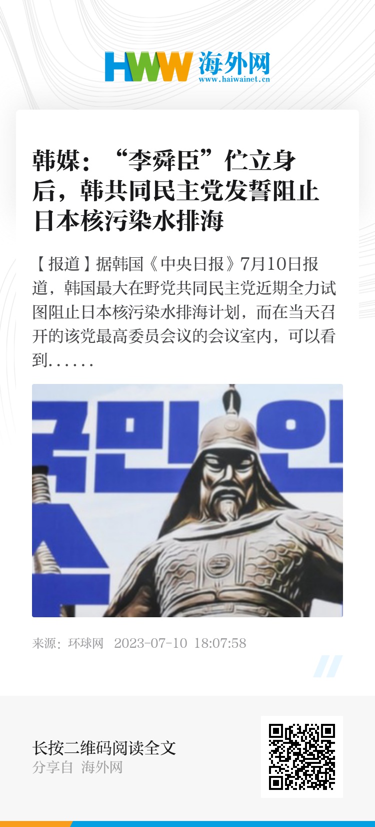 报道称,朝鲜半岛海军名将李舜臣是壬辰倭乱(16世纪末朝鲜半岛抗击日本侵略)时期的抗日民族英雄,共同民主党使用该海报体现了该党希望像李舜臣一样阻止日本核污染水排海污染韩国海洋的决心。报道提到,郑清来在会议上表示,他认为“日本的核污染水应该被埋在日本本土”,朴赞大则指责,“如果尹锡悦政府为核污染水排海背书,就代表着自招他没有为国民安全负责的想法”。