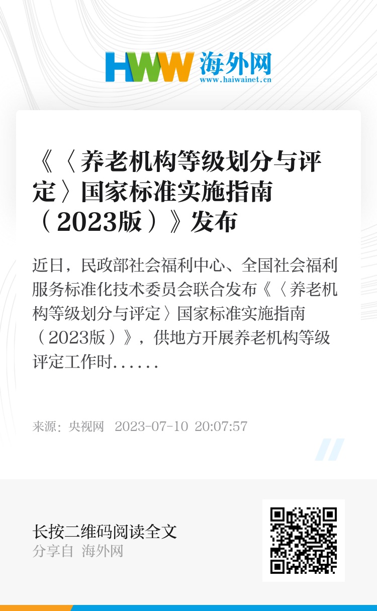 近日,民政部社会福利中心、全国社会福利服务标准化技术委员会联合发布《〈养老机构等级划分与评定〉国家标准实施指南(2023版)》,供地方开展养老机构等级评定工作时参考使用。