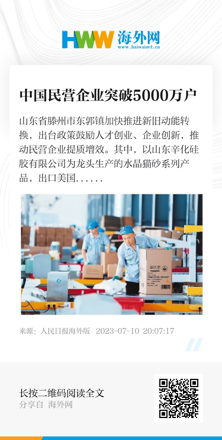 人民日报海外版北京7月9日电 (记者林丽鹂)记者9日从国家市场监督管理总局获悉:我国登记在册民营企业4月初突破5000万户,截至5月底达到5092.76万户,较2012年底(1085.7万户)增长了3.7倍,民营企业在企业中的占比由79.4%提升至92.4%,在国民经济发展中的地位和作用进一步提升。