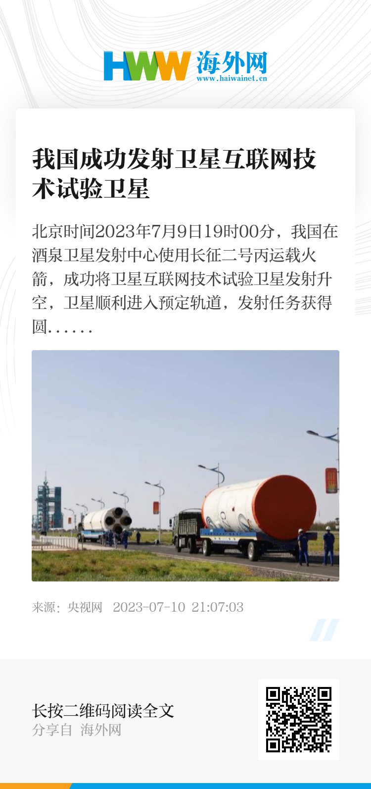 北京时间2023年7月9日19时00分,我国在酒泉卫星发射中心使用长征二号丙运载火箭,成功将卫星互联网技术试验卫星发射升空,卫星顺利进入预定轨道,发射任务获得圆满成功。