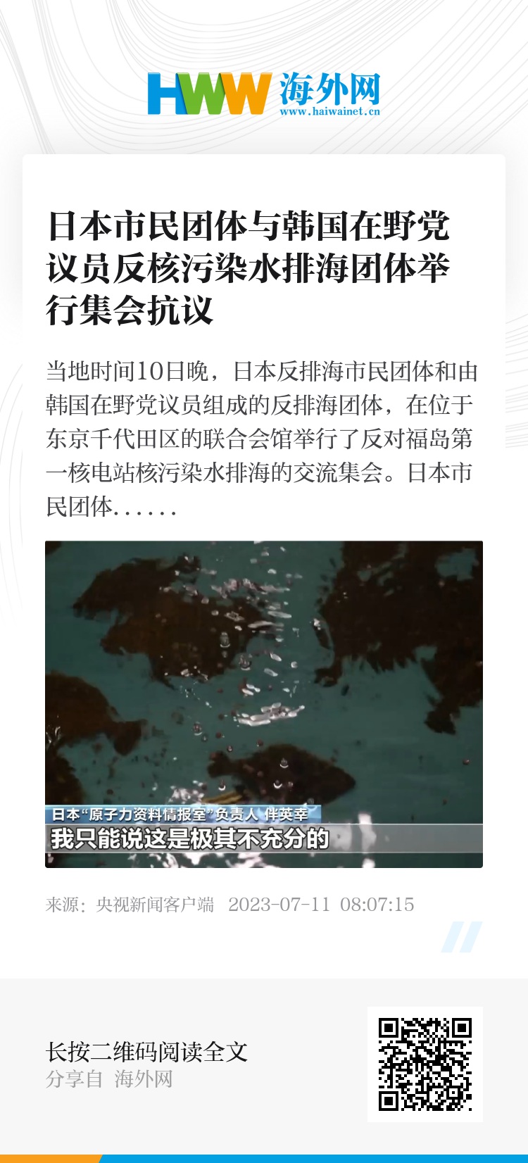 日本市民团体代表及韩国在野党议员均就核污染水排海表达了担忧,对日本政府一意孤行的排海决定表示失望。