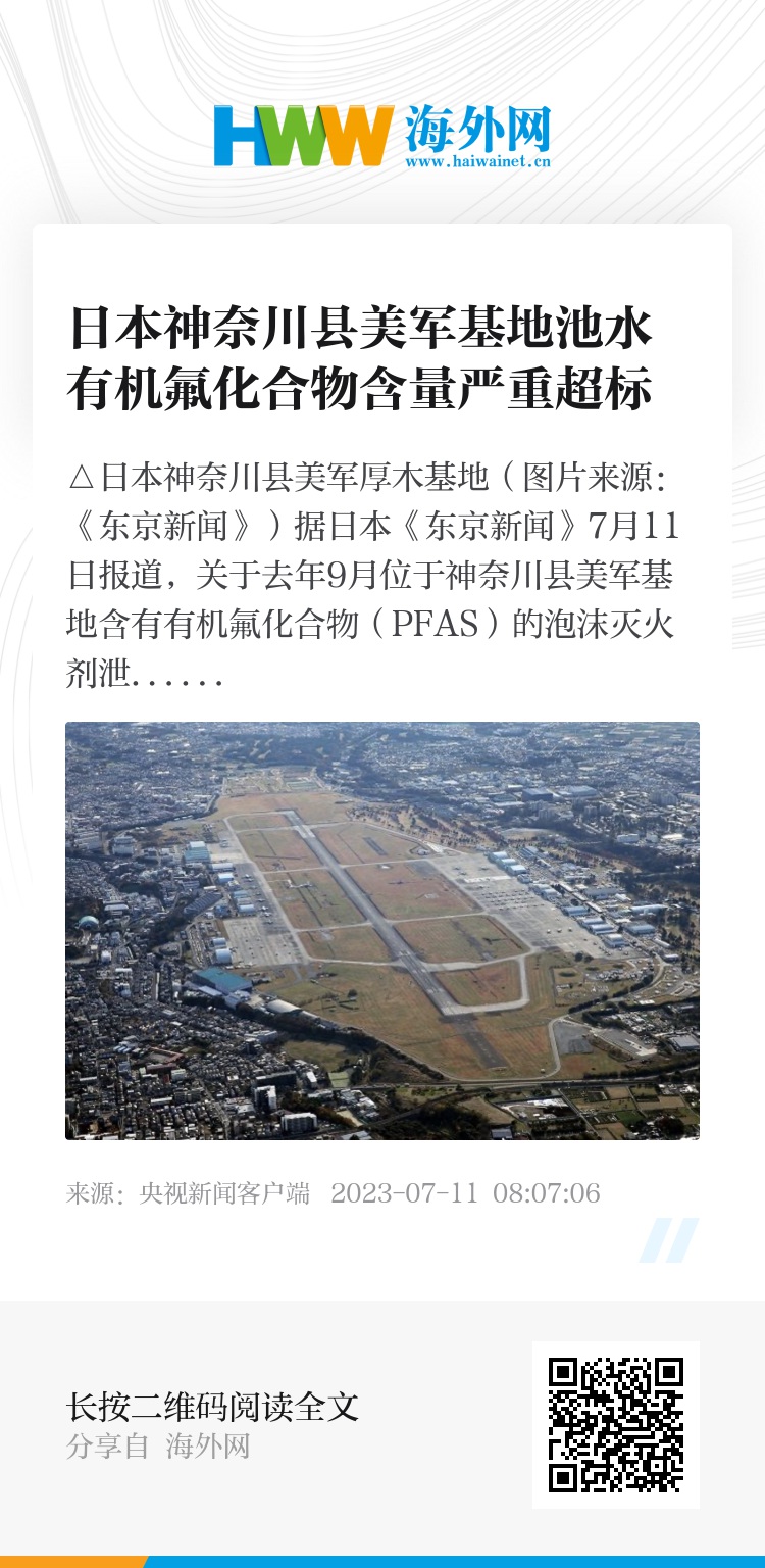 据日本《东京新闻》7月11日报道,关于去年9月位于神奈川县美军基地含有有机氟化合物(PFAS)的泡沫灭火剂泄漏问题,本月10日,神奈川县公布对美军基地内池水的调查结果,在池水中检测到的PFOS和PFOA(PFAS的细分种类)合计值,最高达到每升910纳克,相当于日本暂定安全标准(每升50纳克)的18倍。据日本防卫省解释,泡沫灭火剂泄漏量约为7000升。