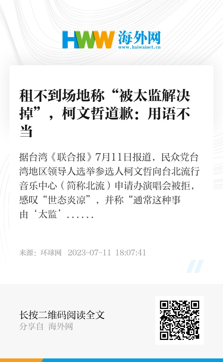 据台湾《联合报》7月11日报道,民众党台湾地区领导人选举参选人柯文哲向台北流行音乐中心(简称北流)申请办演唱会被拒,感叹“世态炎凉”,并称“通常这种事由‘太监’解决掉”。民众党“立委”赖香伶、市议员林珍羽都认为他用词不当。柯文哲今天(11日)下午通过脸书,为自己用语不当致歉,并称“会深刻检讨改进”。