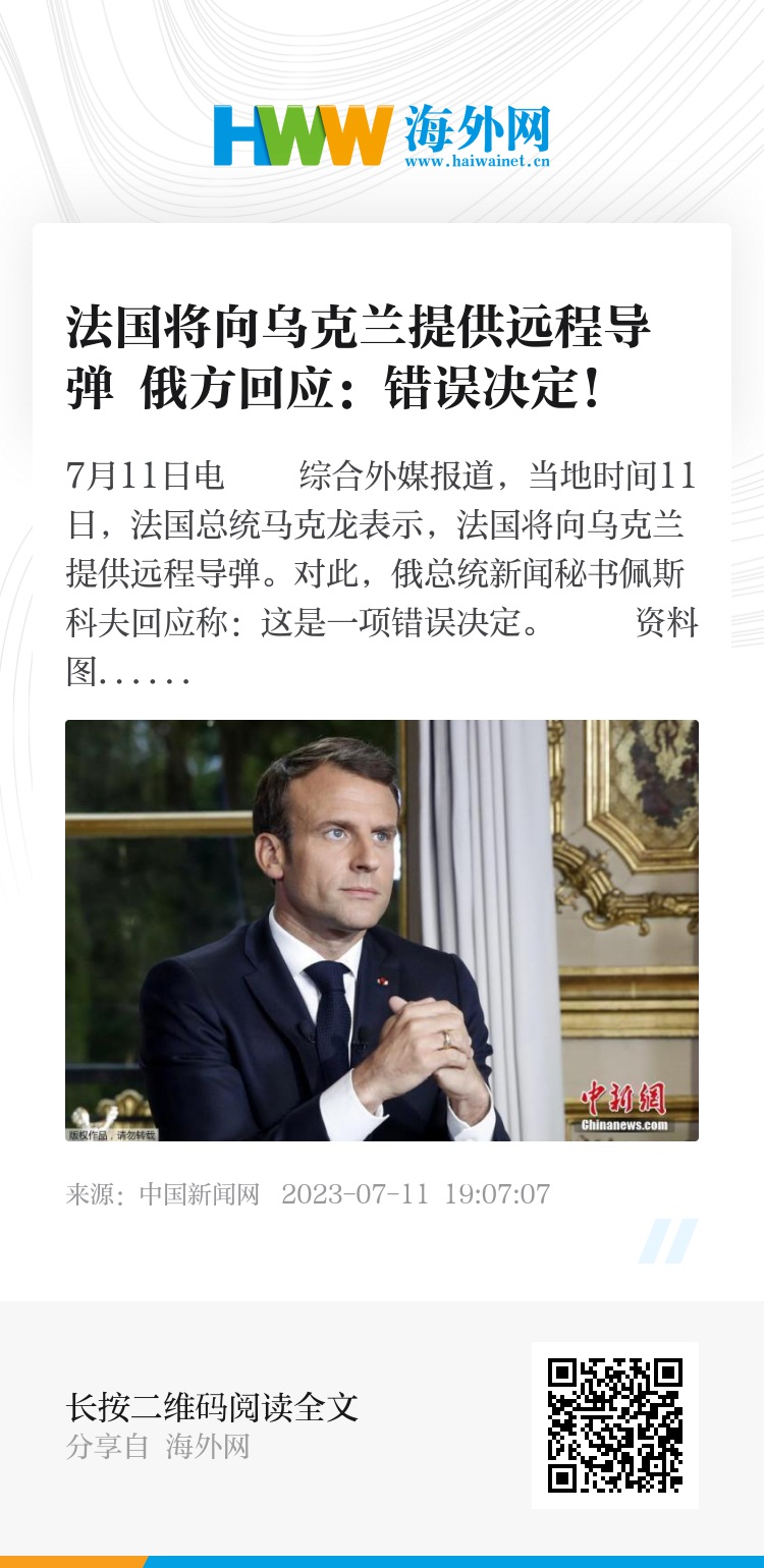 中新网7月11日电 综合外媒报道,当地时间11日,法国总统马克龙表示,法国将向乌克兰提供远程导弹。对此,俄总统新闻秘书佩斯科夫回应称:这是一项错误决定。