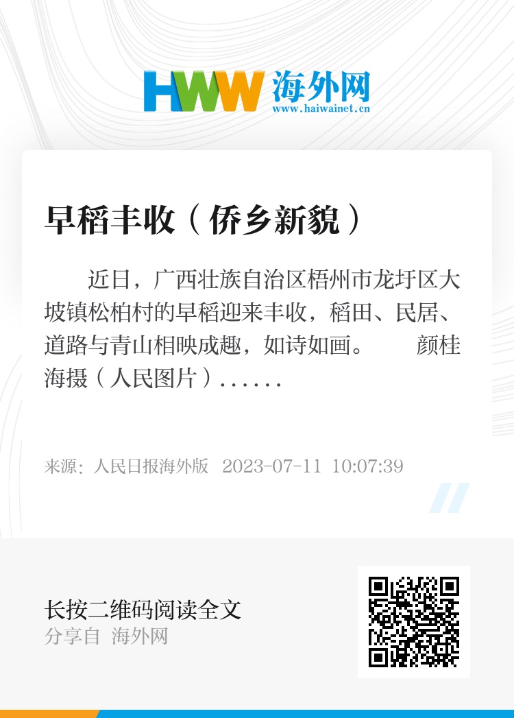 近日,广西壮族自治区梧州市龙圩区大坡镇松柏村的早稻迎来丰收,稻田、民居、道路与青山相映成趣,如诗如画。