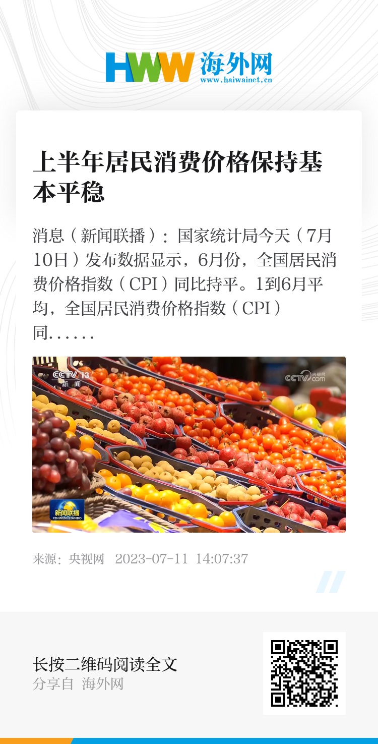 央视网消息(新闻联播):国家统计局今天(7月10日)发布数据显示,6月份,全国居民消费价格指数(CPI)同比持平。1到6月平均,全国居民消费价格指数(CPI)同比上涨0.7%。
