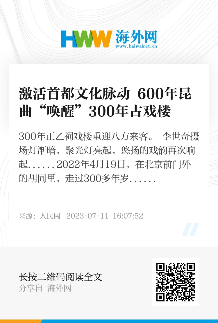 古戏楼重张,是复归,更是一次新生。今年4月,正乙祠戏楼迎来重张一周年纪念,并宣布正式面向社会公众开放,推出“重张一周年演出月”。张鹏介绍,推出的10场演出,不仅有昆曲,还有京剧、民乐、现代舞、西洋音乐等,一经推出便反响热烈,多场演出开票即售罄。“我们将坚定地坚持艺术质量高端化的经营方向,未来也将继续邀请全国知名的艺术家走进正乙祠,让观众能够从中体验到更多中西结合多元文化与新潮流的碰撞。”他说。(董兆瑞 李世奇)