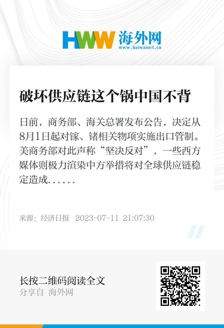 日前,商务部、海关总署发布公告,决定从8月1日起对镓、锗相关物项实施出口管制。美商务部对此声称“坚决反对”,一些西方媒体则极力渲染中方举措将对全球供应链稳定造成破坏。中国对于镓、锗相关物项的管理举措合理合法,对维护全球供应链稳定具有正面作用,美西方企图把破坏全球供应链的帽子扣到中国头上,实属贼喊捉贼。