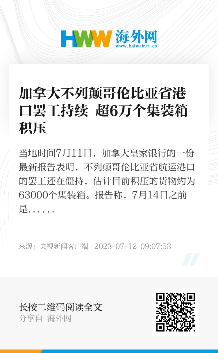 当地时间7月11日,加拿大皇家银行的一份最新报告表明,不列颠哥伦比亚省航运港口的罢工还在僵持,估计目前积压的货物约为63000个集装箱。