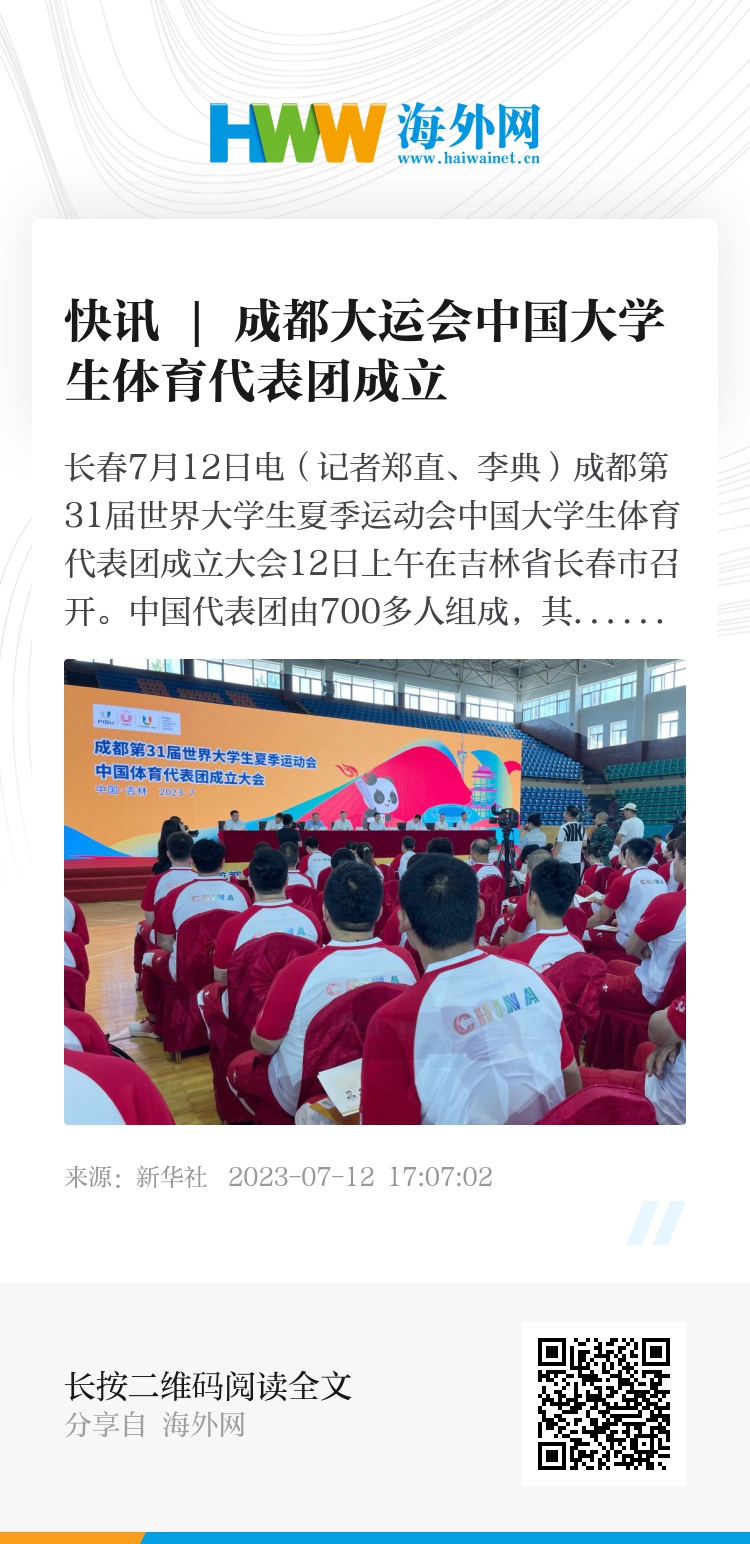 新华社长春7月12日电(记者郑直、李典)成都第31届世界大学生夏季运动会中国大学生体育代表团成立大会12日上午在吉林省长春市召开。中国代表团由700多人组成,其中411名运动员将参加全部18个大项的角逐,实现了“满项报名”的目标。