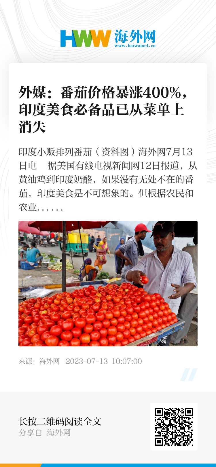 海外网7月13日电 据美国有线电视新闻网12日报道,从黄油鸡到印度奶酪,如果没有无处不在的番茄,印度美食是不可想象的。但根据农民和农业专家的说法,由于炎热气候和大雨导致农作物歉收,番茄价格在印度飙升了400%以上,这种美食必备品现已从印度各地菜单上消失。