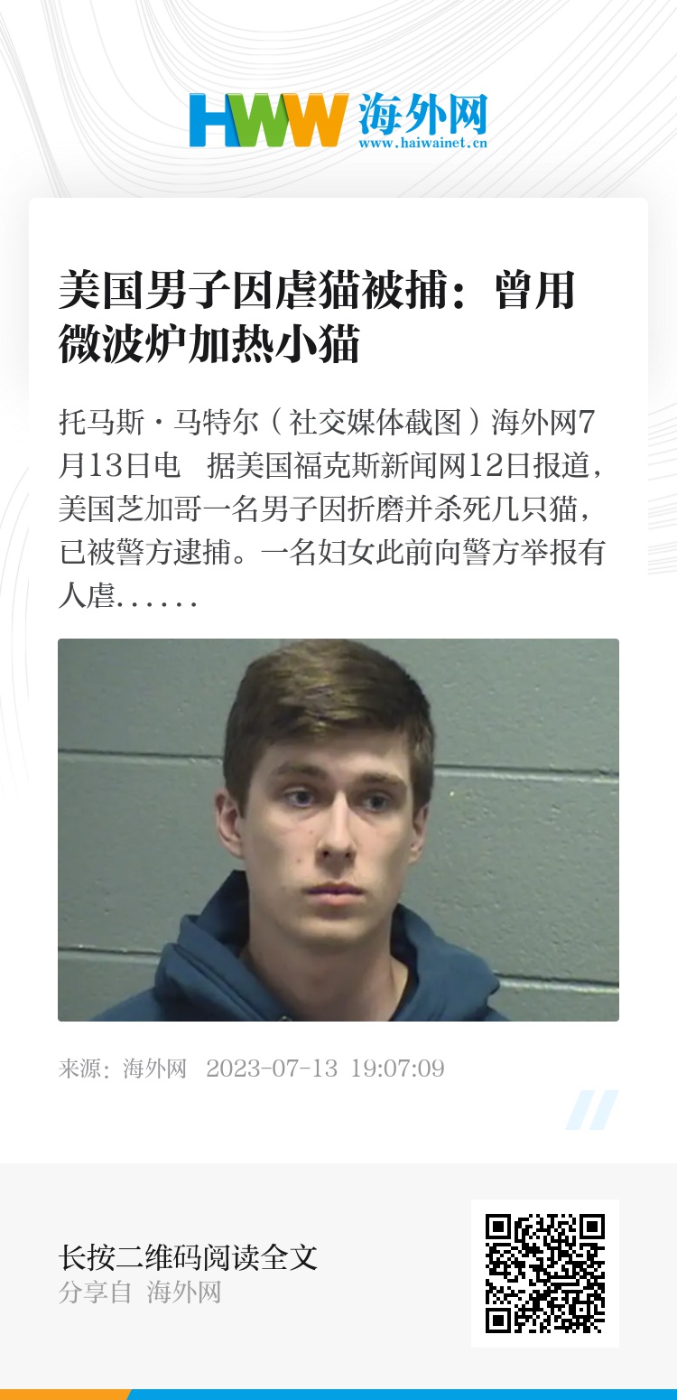 海外网7月13日电 据美国福克斯新闻网12日报道,美国芝加哥一名男子因折磨并杀死几只猫,已被警方逮捕。