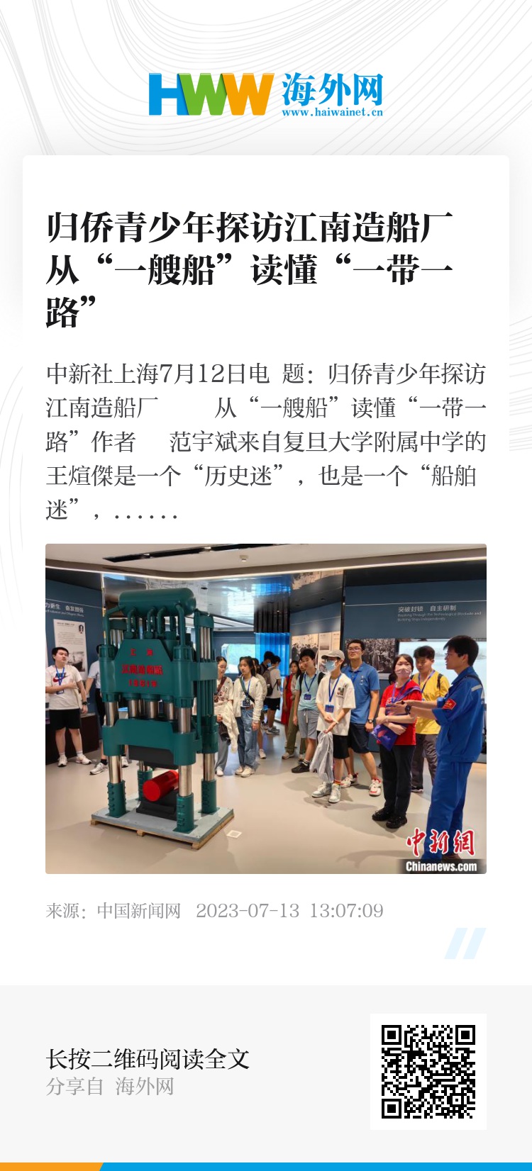 中新社上海7月12日电 题:归侨青少年探访江南造船厂 从“一艘船”读懂“一带一路”